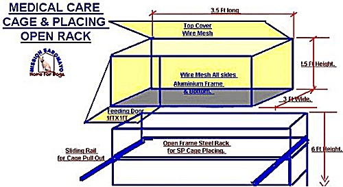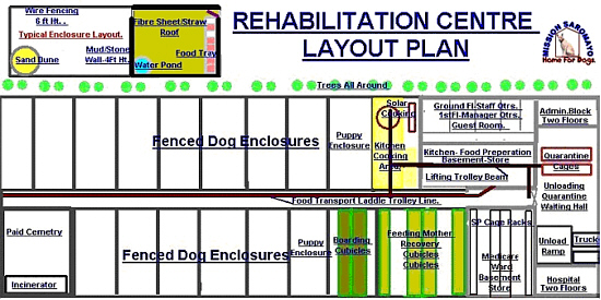 Aim, Appeal & Operational Planning for Integrated Street Dog Rehabilitation Programme with Layout & Equipment Details.Action Plan:The objective of this Home for Dogs is to give relief to as many as stray and abandoned Dogs and puppies as possible to make our towns and cities free of stray dogs. All distressed dogs will get a home, food and treatment. Every thing connected to this project are sponsored by the donors and no govt. or other external help whatsoever have been contributed. The Home is run on the Order of God. The Home has been designed to accommodate 500 dogs at full capacity by accommodating 10 dogs per shelter of 100 Sq.ft. covered space and 400Sq.ft open space surrounded with wire net. They will have elevated resting place with rags for their comfort. Orientation of shelters will allow adequate morning sunray exposure and continuous south east breeze. The slopping floor will not allow accumulation of fleece and urine and periodical washing with disinfectant will ensure total hygiene. Asbestos sheet roof is heat insulated with thermocole ceiling. Quilt & blanket curtains will insulate from cold and severe wind. Food service will be given through the service corridor on the oblong trays & SS Pots beneath the wire netting. Service Block consisting of Kitchen, Store and Cook Qtrs are integrated with the row shelters. (refer layout diagram). On arrival of dogs and puppies, they will be segregated in to sick and healthy categories and will be sent to respective shelters for administration of vaccines to all. Sick ones will be sent to the Medical Block for treatment. Diseased ones will be isolated in Isolation Wards. Male and female dogs will be segregated into 1: 3 ratio to make them a compatible group. of 5 dogs. All male dogs will be sterilized. The group formation will take 4 to 6 weeks and after that they will be introduced in villages. All healthy and recovered dogs will be rehabilitated in villages and only the very weak, disabled, blind, diseased and sponsored dogs will remain at Home. All dogs remaining in Home will get DAP Vaccination. The puppies will get both DAP and ARV vaccine with booster dose after 4 weeks. They will be segregated as per age and condition in three tier special shelter for puppies. After 4 weeks the puppies will be sent to Puppy Mela for adoption at the MS HQ. at Marredpally. Periodical advertisements will be made for urging people to attend Puppy Mela for adoption. Puppies remaining un-adopted after 8 weeks will be sterilised and will be formed in a group for rehabilitation in villages. Other adult dogs to be prepared for rehabilitation, will get ARV. All abandoned pedigreed dogs will separately sheltered and will be vaccinated with DAP and AVR . They will get different food initially and then gradually transferred to standard Home food. They will also be offered for adoption. They will not be rehabilitated in villages and will remain in Home, if no one adopts them. The salient points to be covered under a policy that will STRICTLY follow the Prevention of Cruelty to Animals Act 1960. are as under: 1. Dog Collection: 2. Dog/ Puppy delivery to Centralised Dog Shelter & segregation. 3. Dog Immunization from Rabies, Sterilization and Post Operation Care. 3. Dog & Puppy Re-instating & Rehabilitation 4. Public Awareness on Puppy/Dog Tolerance/Adoption. 5. Placement of dogs for security duty in police, factories, apartment houses, public places, govt & security establishments etc. 6. Dog/Animal Welfare Programme. 7. Pilot Project for Puppy & Distressed Dog Rehabilitation. 8. Study Tour to Visakhapatnam Municipal Corpn & V S.P.C.A Joint project. 1. Dog Collection: Public will be advised to take their puppy or dog to Achampet to see the arrangements themselves, otherwise we will collect Rs. 200 per dog per trip to send or bring him\her to/from Achampet. All amounts will be collected in advance and in cash only, under a receipt. COLLECTED DOG ACCOMMODATION: All collected dogs & puppies will be brought to a CENTRALISED DOG SHELTER for keeping them for inspection and quarantine, as per the procedure mentioned below: (Immediate Task: Utilising vast open areas like Old Slaughter House at Bhoiguda, with tin shades, the present congestion at Chudi Bazar Dog Pound is to be removed expeditiously. ) Maintenance of Dogs and Puppies. The dogs brought in for rehabilitation will go for initial acclimatizing of 10/15 days in separate enclosures. Then they will be allowed to intermix with other enclosure dogs. After that they will go to the common playground to form groups. Group formation in tens with the ratio of 1:3 will be implemented. Finally they will be inducted with ID tags in various villages with records of their placements for behavioral studies at new environments. All sponsored dogs are trained for giving them full freedom of movement as per their will. Selected dogs will be trained for Sniffer Duty in collaboration with Retd. Brig. , who is world famous in training Indian dogs for sniffer duty for various state police including J&K State. Food as per prescribed norms will be provided in trays and bowls, two times a day. Strict watch will be kept on the non consumption of food or equal sharing of food by all. Special Foods will be served in Medical Hospital and Guest Shelters. Regular baths will be given through showers fitted to hose and the diseased ones will be given Sulpher Soap solution bath & Neem Oil message. Food Standardisation: Our main emphasis remains on giving balanced food to prevent illness, as prevention of diseases is most economical than giving treatment and medicine. After extensive studies made with different kinds of food, we have arrived at the best and cheapest food to maintain them in healthy condition. 1 kg of food is provided to a adult dog 3/4th Kg to a 1month to 4 month old puppy per serving two times a day. All get an indigenous morning breakfast tonic of light curd lassi mixed with rice paste, rock salt and sugar. Infants are fed
